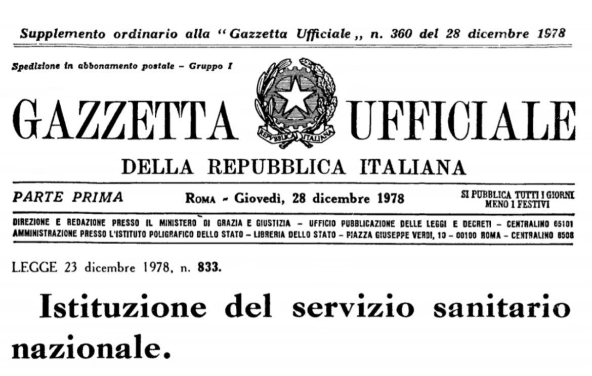 - La legge 833 del 23 dicembre 1978 istituisce in Italia il Servizio Sanitario Nazionale; con essa il concetto di salute viene inteso come un diritto universale dell'individuo riconosciuto a tutti. Nell'articolo 1 della legge si afferma che tale servizio è costituito dall'insieme degli organi, delle strutture, delle funzioni e delle attività destinate alla tutela della salute fisica e psichica di tutti i cittadini. Questa fu la prima legge che rese effettivo il diritto alla salute sancito dalla Costituzione. Il SSN è articolato su tre livelli ovvero Stato, Regioni e Comuni. Al primo vengono attribuiti compiti di programmazione nazionale e il piano sanitario nazionale; alle seconde compiti inerenti alla programmazione regionale, il piano sanitario regionale e l'emanazione di norme per l'organizzazione delle Unità Sanitarie Locali (USL) nonché strutture operative dei Comuni, articolate in distretti sociosanitari per l'erogazione dei servizi di primi livello e pronto intervento. Nelle USL vi era la figura dell'assistente sociale che si doveva occupare dei problemi sanitari con rilevanza sociale; ai terzi compiti di gestione a livello locale in quanto ritenuti unici responsabili istituzionali della tutela della salute.